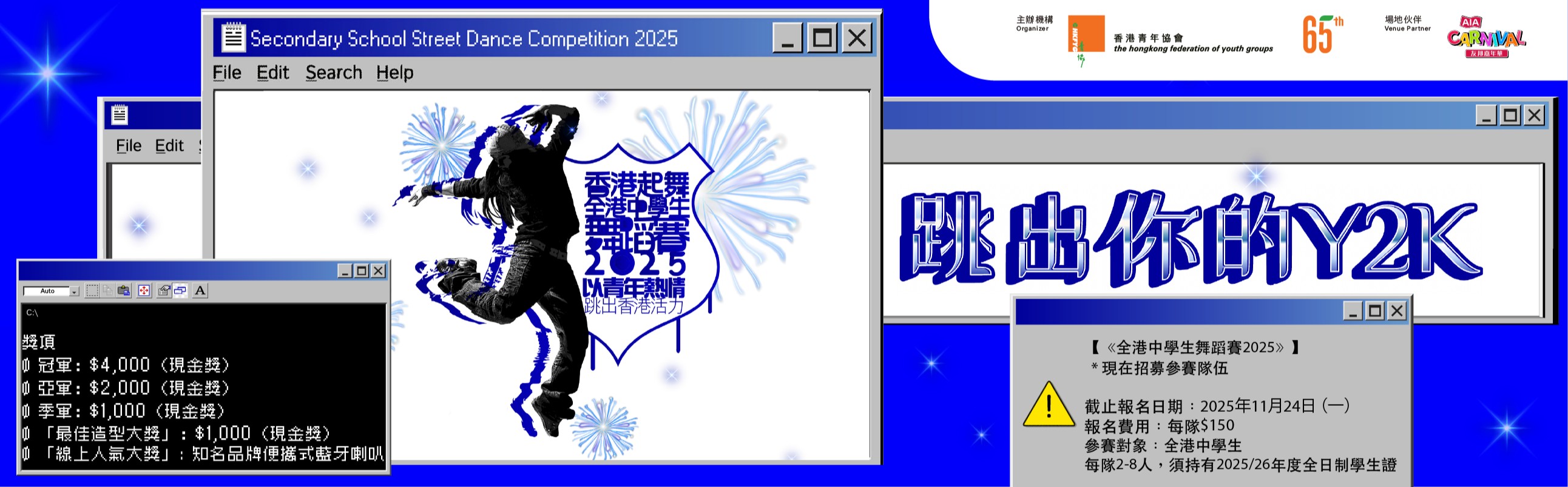 「香港起舞.全港中學生舞蹈賽2025」誠邀全港中學生以Y2K為主題,用舞蹈詮釋你心目中的2000年代,展現你們的創意與活力,讓Y2K的魅力在舞台上再次閃耀!